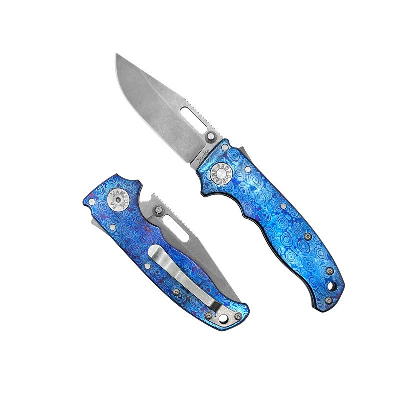 Rukojeť je z nádherného, modrého, damaškového titanu. Rukojeť je díky tomuto materiálu dostatečně pevná, aby nemuselo být použito přídavné vložkování rukojeti ocelovými vložkami. Zároveň je vysoce odolná proti korozi. Nůž je díky použitému materiálu velmi tenký (tělo nože bez spony 1cm) a velmi lehký. Modrý dmaškový titan je exkluzivní matriál, který dodal noři naprostou vyjímečnost.