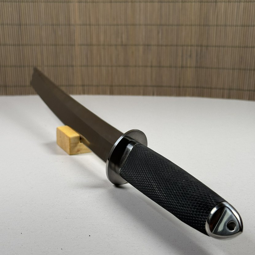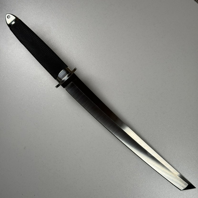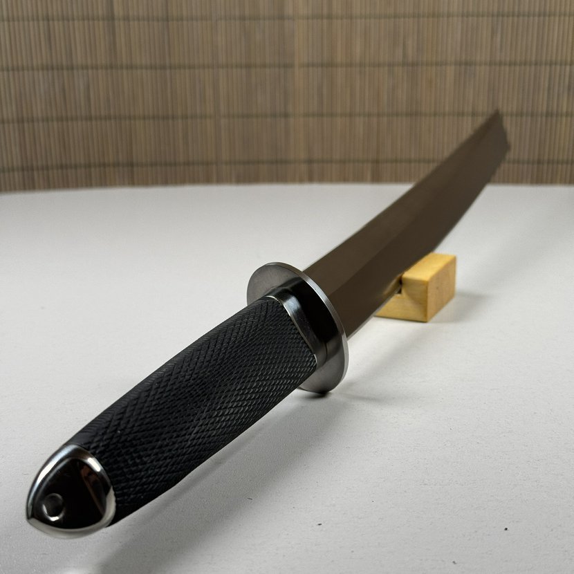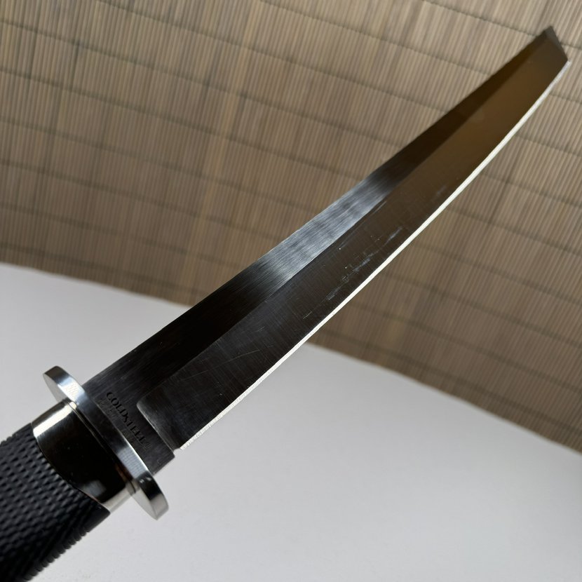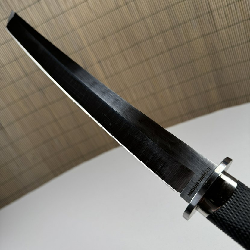 Tento konkrétní kus má vadu z výroby. Záštita ve vrchní části rukojeti není pevně slisována na rukojeť, a tak při rychlejším pohybu vpřed cvaká. Vada nijak neovlivňuje funkčnost nože nebo bezpečnost při používání. Chybí originální pouzdro. 3V Master Tanto XII od COLD STEEL je pevný nůž s jedinečnými vlastnostmi pro sek. Byl to právě Cold Steel, kdo navrhl a zpopularizoval tento styl začátkem devadesátých let. Naše čepele, vyrobené z americké oceli CPM 3-V jsou vysoce houževnaté. Naše čepele, vyrobené z americké oceli CPM 3-V jsou vysoce houževnaté. CPM 3-V je nástrojová ocel, odolná proti zlomení a celkovému opotřebení. CPM 3V je nástrojová ocel vyrobená procesem práškové metalurgie s rovnoměrnou mikrostrukturou. Její chemické složení jí dávají především extrémní houževnatost, odolnost proti vylamování a velice dobrou odolnost proti opotřebení. CPM 3V nabízí větší houževnatost než například D2. Standardní tvrdost CPM 3V se pohybuje v rozmezí 58 až 60 HRC. CPM 3V často nahrazuje vysoce legované nástrojové oceli v provozech, kde dochází k chronickým problémům s popraskáním či zlomením nástrojů. Její chemické složení snižuje odolnost proti korozi, proto nože z této oceli by měli mít následnou povrchovou úpravu, nebo jejich majitel musí dbát zvýšené pozornosti a nůž pravidelně ošetřovat. Jak primární, hlavní ostří, tak sekundární ostří na hrotu Tanto čepele, jsou ručně dobrušované. Průsečík těchto dvou čepelí (známých jako Yakote) vytváří velmi účinný sekundární hrot, který umožňuje ničivý efekt při sekání. CPM 3-V Magnum Tanto XII je vysoce odolný proti opotřebení.