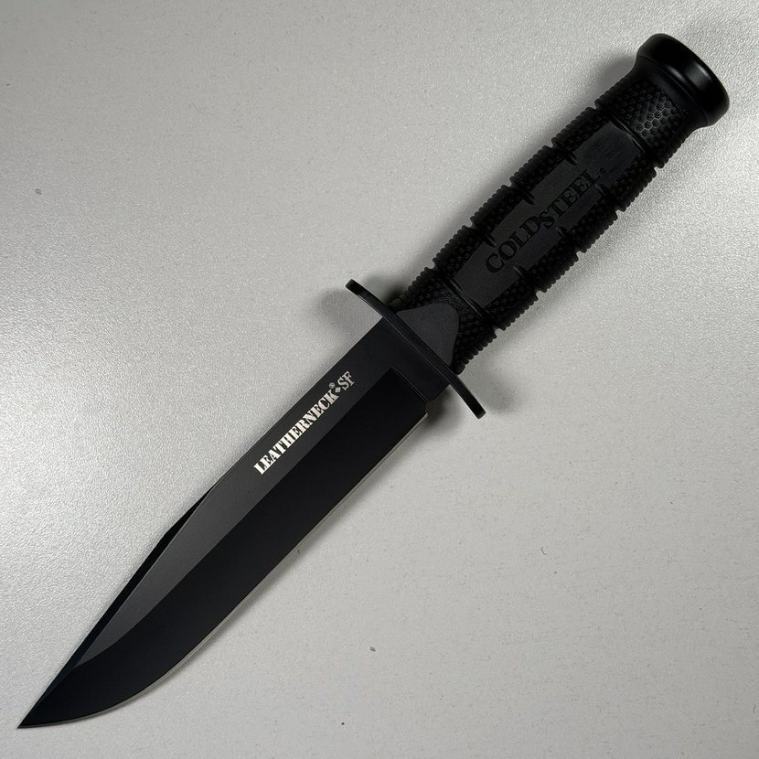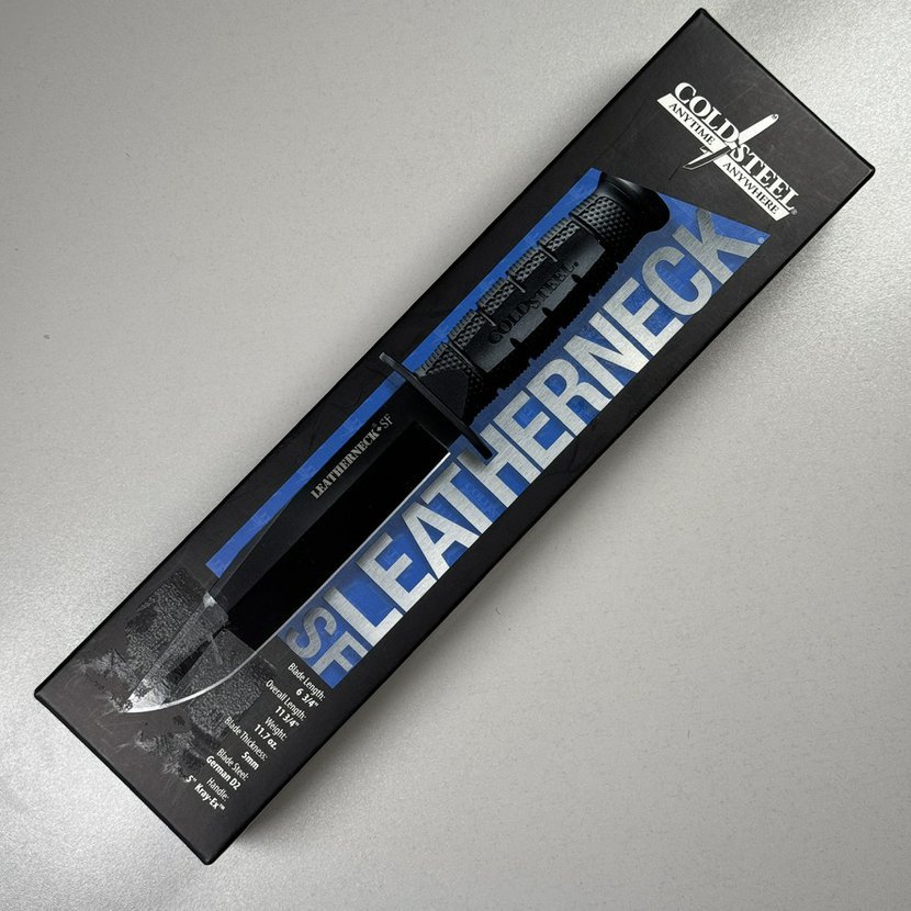 Cold Steel Leatherneck má čepel vyrobenu z Oceli D2. Jde o zápustková ocel vhodnou pro kování za studena s vyšším obsahem přísad. Zvláště obsah chrómu a uhlíku jsou obsahově vysoké. Ocel má vysokou odolnost proti opotřebení, velice dobře drží ostří, ale s tím klesá obrobitelnost a hůře se ostří obnovuje. Je poměrně korozivzdorná, ale nejedná se o nerezovou ocel. Proto je čepel pro jistotu ošetřena protikorozní, nereflexní povrchovou úpravou z černého prášku.