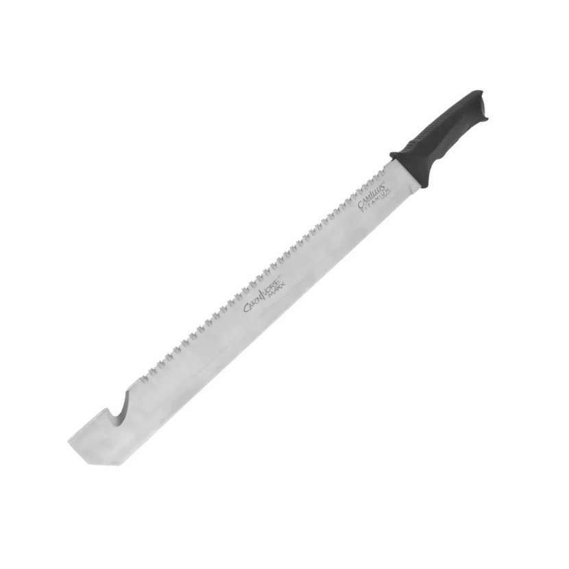 Camillus CARNIVORE MAXX 2.0 je doopravdy dlouhá mačeta, která je se svou rovnou čepelí vhodná jak na kácení menších stromků, tak i na řezání větví. Čepel je totiž vybavena na jedné straně rovným ostřím a na straně druhé zoubkovaným ostřím, jenž zabírá 80 % hřbetu čepele. Na konci hřbetní strany čepele je navíc mačeta vybavena hákem.