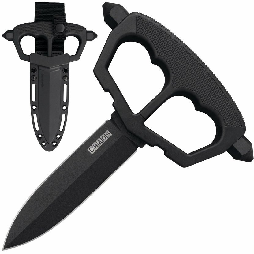 Noži dominuje "D" chránič ruky vyrobený z pevnostního hliníku 6061. Řada Chaos® se inspirovala u tradičních „Trench knives“, zákopových nožů I. světové války. Nože Chaos® jsou pevné nože s hladkým ostřím, vyrobené z oceli SK-5. Dominantním znakem je masivní chránič ruky z pevného hliníku 6061 a hrot na hřbetu rukojeti z uhlíkové oceli 1055. Čepel je oboustranně nabroušená a je vyrobena z Japonská vysoce uhlíková ocel SK-5 je tradičně používána pro výrobu široké škály ručního nářadí včetně dlát a pil na dřevo, vrtáků apod. Ocel vykazuje vysokou houževnatost, velmi dobře drží ostří a má velkou odolnost proti otěru. Čepel je dále ošetřena černou povrchovou úpravou Black Tuff-Ex™ proti korozi. Jde o podobný materiál teflonu.