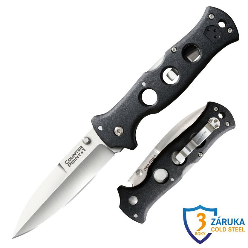 Zavírací nůž Counter Point II od firmy COLD STEEL patří do řady zavíracích nožů s dvojitým ostřím. Čepel je vyrobena z japonské oceli AUS8A vakuově kalená do oleje a následně žíhaná pro dosažení zvýšené pevnosti a tvrdosti. S ohledem na vyšší podíl nerozpuštěných karbidů má vyšší odolnost proti opotřebení, ale nižší stabilitu ostří. Díky silné špičce zajišťuje nůž velni velkou průchodnost materiálem. Counter Point II má horní ostří falešné proto se brousí pouze spodní část ostří. Rukojeť je vyrobena z materiálu Griv-Ex a je vyztužena teplně zpracovanými hliníkovými vložkami. To dělá Counter Point nejen velmi pevným, ale pohodlným a bezpečným. Je vhodný pro skryté nošení.