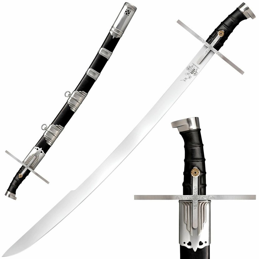 Maďarsko je na základě své polohy na mapě světa zemí, která se rozprostírá na pomezí kulturních vlivů Východu a Západu. Tyto vlivy se samozřejmě přímo odráží i v maďarských zbraních. Maďarská šavle je primárně sečná zbraň, většinou používaná z koňského hřbetu, ale i boj muže proti muži nebylo výjimečné. Čepel maďarské šavle je vyrobena z pružinové, vysoce uhlíkové oceli 1055. Má sekerový hrot, což znamená, že zhruba 20cm na špičce šavle je čepel rozšířená. To v praxi přenáší váhu na hrot šavle a sek je tak důraznější. Záštita naší šavle má velmi široké a robustní quillony. Širší quillony nabízejí větší ochranu ruky i předloktí. Díky větší šířce této záštity dokáže zkušený šermíř zachytit ránu namířenou na jeho ruku, zápěstí nebo předloktí, pouze menším kroucením zápěstí, protože dlouhé quillony pokrývají velký úhel a stačí jen minimální pohyb, aby obránce zablokoval cestu blížící se čepeli. Součástí dodávky je nádherně zpracovaná kožená pochva. Kování pochvy zvýrazňuje lehký kontrast s černým koženým tělem pochvy.