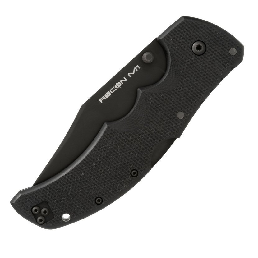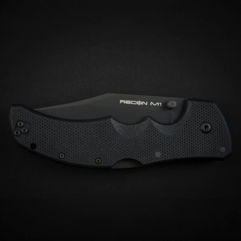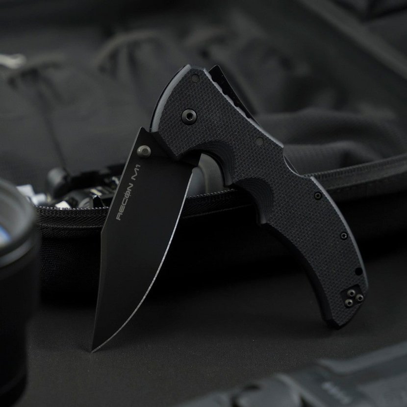 Recon 1 je jedním z nejpopulárnějších taktických zavíracích nožů z produkce Cold Steel. Důkazem jeho popularity je i dlouholetá výroba a poptávka po této řadě nožů. Čepel je vyrobena z CPM MagnaCut což je nerezová ocel s velmi dobrými vlastnostmi a jemnou strukturou. Při správném tepelném zpracování dosahuje velmi vysoké tvrdosti. Tato velmi speciální třída oceli byla vyvinuta přímo pro nožířský průmysl. Dosahuje tvrdosti mezi 62 až 64 HRC. Nezvyklý vzhled a exkluzivitu nože dodává černá stonewash povrchová úprava. Rukojeť z G-10 má na svém povrchu jemnou texturu, zdrsnění, pro lepší a bezpečnější držení. Nůž je osazen oboustranným kolíčkem pro otevírání a i tato řada nožů je vybavena unikátním patentem Cold Steel® Tri-Ad Lock™. Pojistka zabraňuje samočinnému nebo nechtěnému zavření nože i po přirozeném opotřebení v průběhu času. V balení dostanete i klips pro nošení na levé straně.