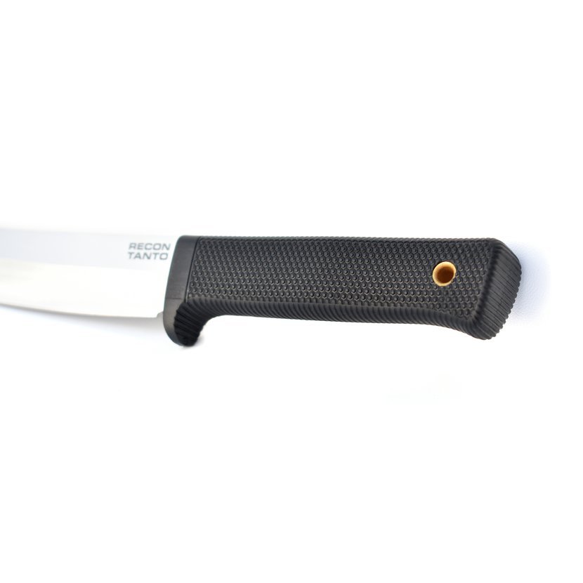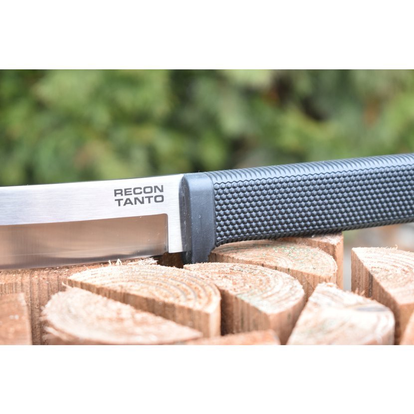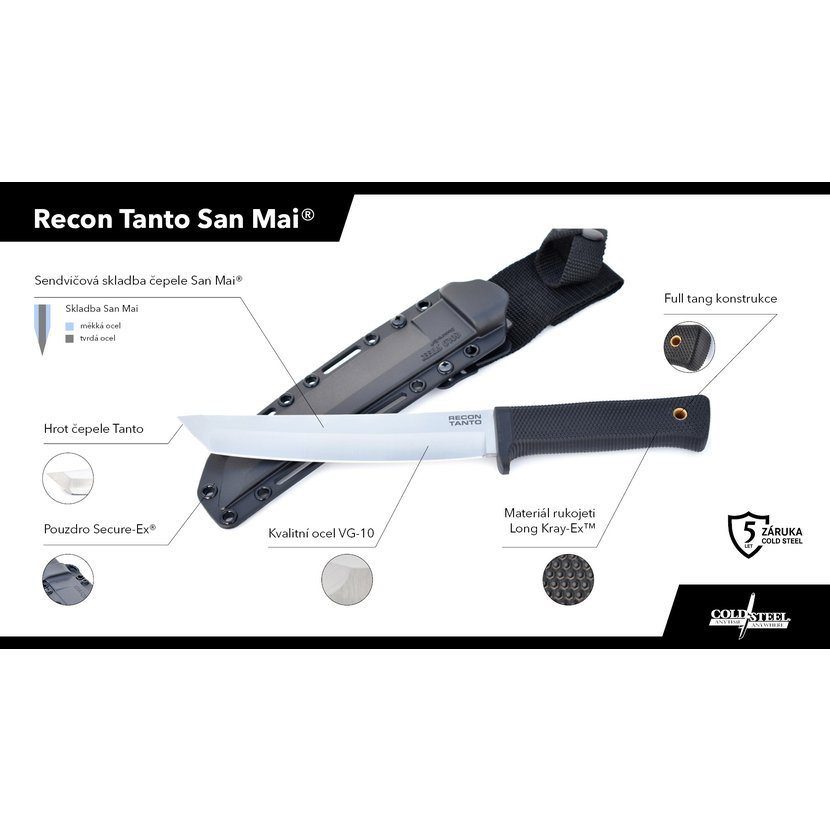 Nový Recon Tanto v provedení San Mai® je pevný nůž s jedinečnými vlastnostmi pro sek. Byl to právě Cold Steel, kdo navrhl a zpopularizoval čepel "americké Tanto" začátkem devadesátých let. Americké Tanto má oproti svému japonskému předchůdci vyztužené sekundární ostří, aby nedošlo k jeho poškození při sekání pevnějších materiálů. Recon Tanto má uplatnění v armádních a policejních složkách po celém světě. V posledních 20 letech se Recon Tanto účastnilo při řešení mnoha válečných konfliktů jako součást výbavy zasahujících složek. Naše čepele, vyrobené technologií San Mai III byly po desetiletí doménou Cold Steelu. San Mai III technologie vychází z praktik výrobců japonských mečů. Jde o sendvičovou skladbu čepele z vrstev o rozdílné tvrdosti. Zatím co střední vrstvu tvoří tvrdá ocel s vysokým obsahem uhlíku, dvě vrchní vrstvy jsou vyrobeny z oceli podstatně houževnatější, aby bránily střední vrstvě v popraskání. Čepel se tak stává maximálně odolná proti ztrátě ostří bez nebezpečí zlomení. Ale tyto luxusní čepele jsou vyráběny pouze v omezeném počtu. Ocel VG-10, která je použita na výrobu této čepele, je nerezová ocel s vysokým obsahem uhlíku. Perfektně tvarovaná rukojeť nože z materiálu Kraton (Long Kray-Ex™) nabízí neklouzavý povrch. Výborně padne do ruky a umožňuje i velmi jemnou práci s nožem v mokrém a blátivém prostředí. Nůž je dodáván včetně Secure-Ex® pouzdra.