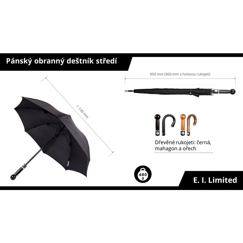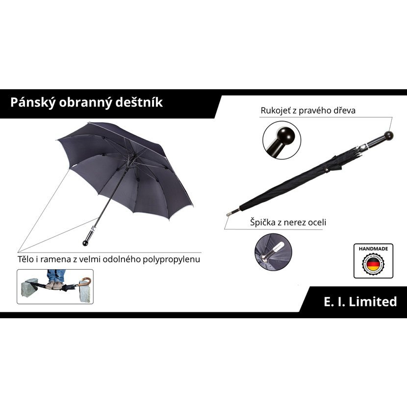 Černý pánský deštník na sebeobranu s černou holovou rukojetí, od německé firmy E.I.Limited, je údernou zbraní pro sebeobranu. Velmi tuhé tělo deštníku a odolná ramena z polypropylenu jsou konstruována pro vysoké namáhání a nárazy. Rukojeť z barveného ořechu poslouží jako úderná část deštníku, ale také pomocí ní můžete protivníka zachytit. Deštník je i přes jeho určení plně funkční a ochrání Vás proti dešti. Na deštníku je zřetelná německá kvalita i preciznost zpracování.