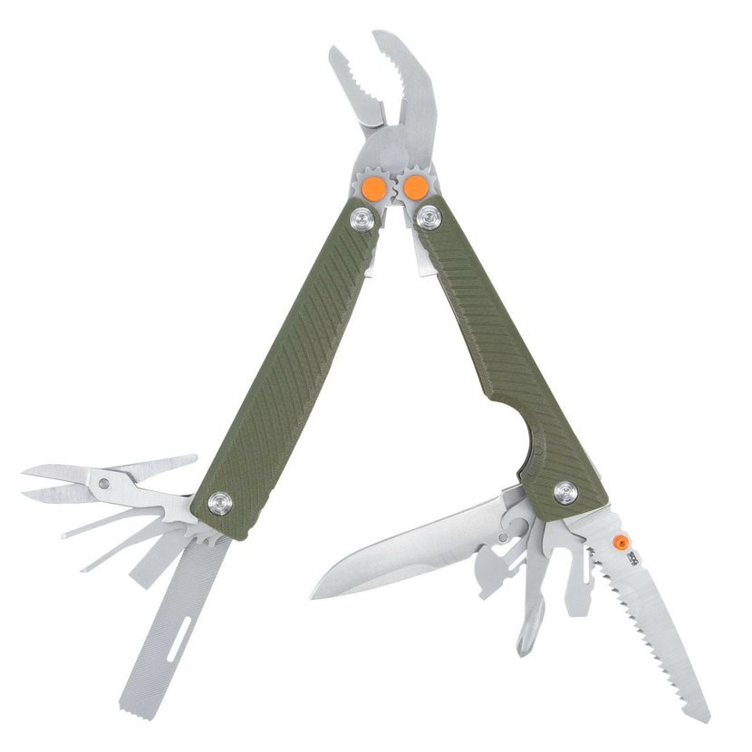 • Všestranost: Vybaven 15 základními nástroji pro venkovní použití v kompaktním balení o hmotnosti 130g. Včetně kleští s patentovanou pákou SOG, čepele CRYO 440 2,5" a pily.