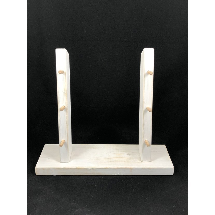 Dřevěný stojánek na nože se třemi stanovišti. Výška stojánku 22 cm, šířka mezi kolíky 15cm, vertikální rozteč mezi kolíky je 6 cm. Stojánek je vyroben z masivního smrkového dřeva a v některých variantách opatřen nátěrem.