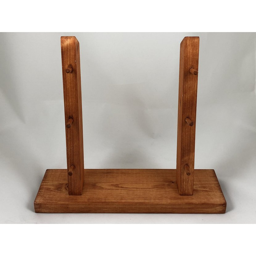 Dřevěný stojánek na nože se třemi stanovišti. Výška stojánku 22 cm, šířka mezi kolíky 15cm, vertikální rozteč mezi kolíky je 6 cm. Stojánek je vyroben z masivního smrkového dřeva a v některých variantách opatřen nátěrem.