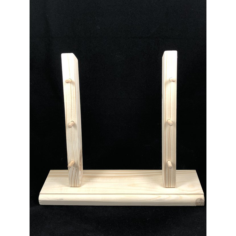 Dřevěný stojánek na nože se třemi stanovišti. Výška stojánku 22 cm, šířka mezi kolíky 15cm, vertikální rozteč mezi kolíky je 6 cm. Stojánek je vyroben z masivního smrkového dřeva a v některých variantách opatřen nátěrem.