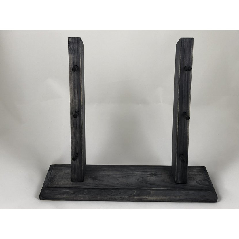 Dřevěný stojánek na nože se třemi stanovišti. Výška stojánku 22 cm, šířka mezi kolíky 15cm, vertikální rozteč mezi kolíky je 6 cm. Stojánek je vyroben z masivního smrkového dřeva a v některých variantách opatřen nátěrem.